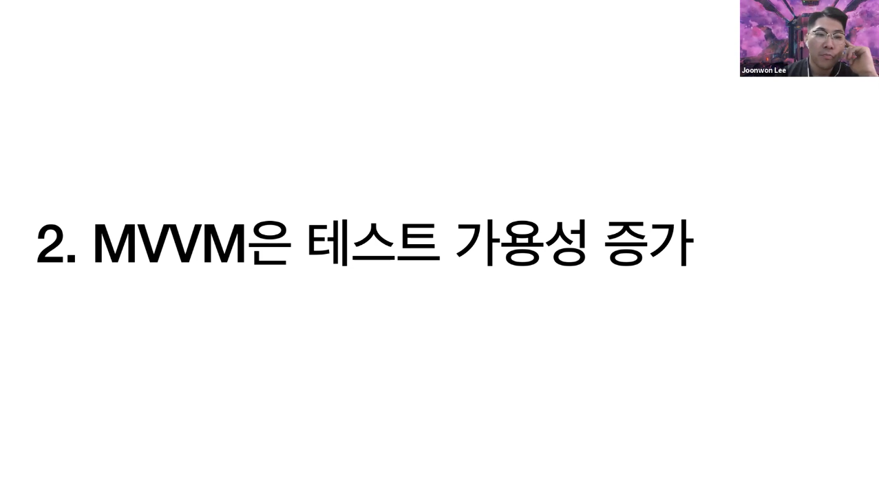 다음으로, MVVM은 테스트를 하기에 용이해집니다.
