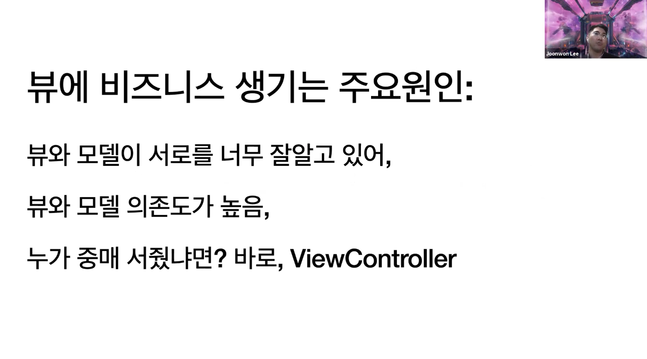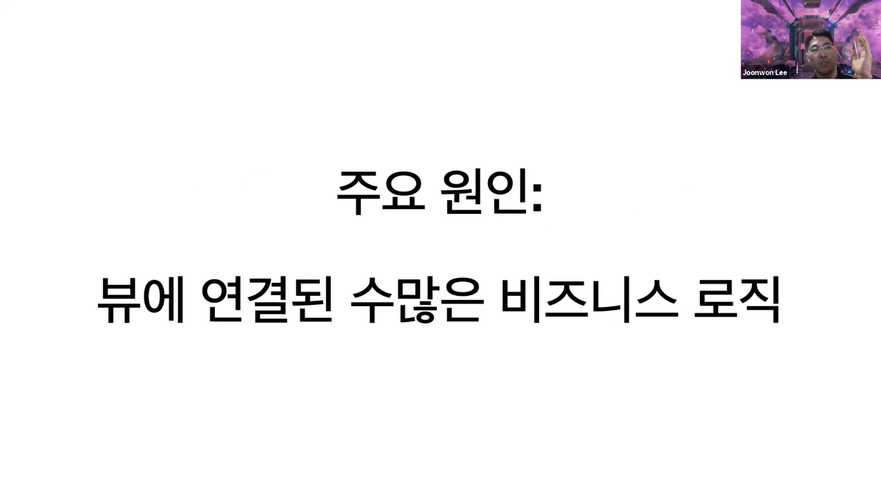 주요 원인은 뷰에 연결된 수많은 비즈니스 로직들입니다.