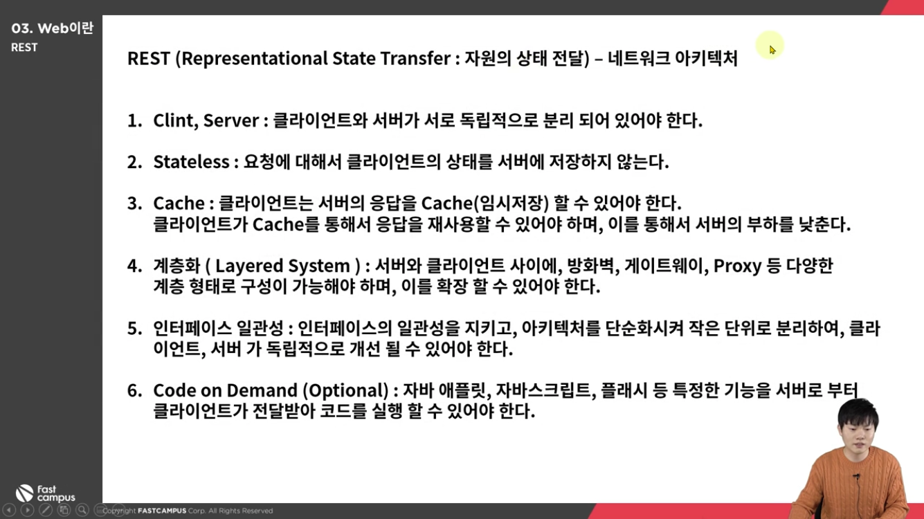 6. Code on Demand(Optional): 자바 애플릿, 자바스크립트, 플래시 등 특정한 기능을 서버로부터 클라이언트가 전달받아