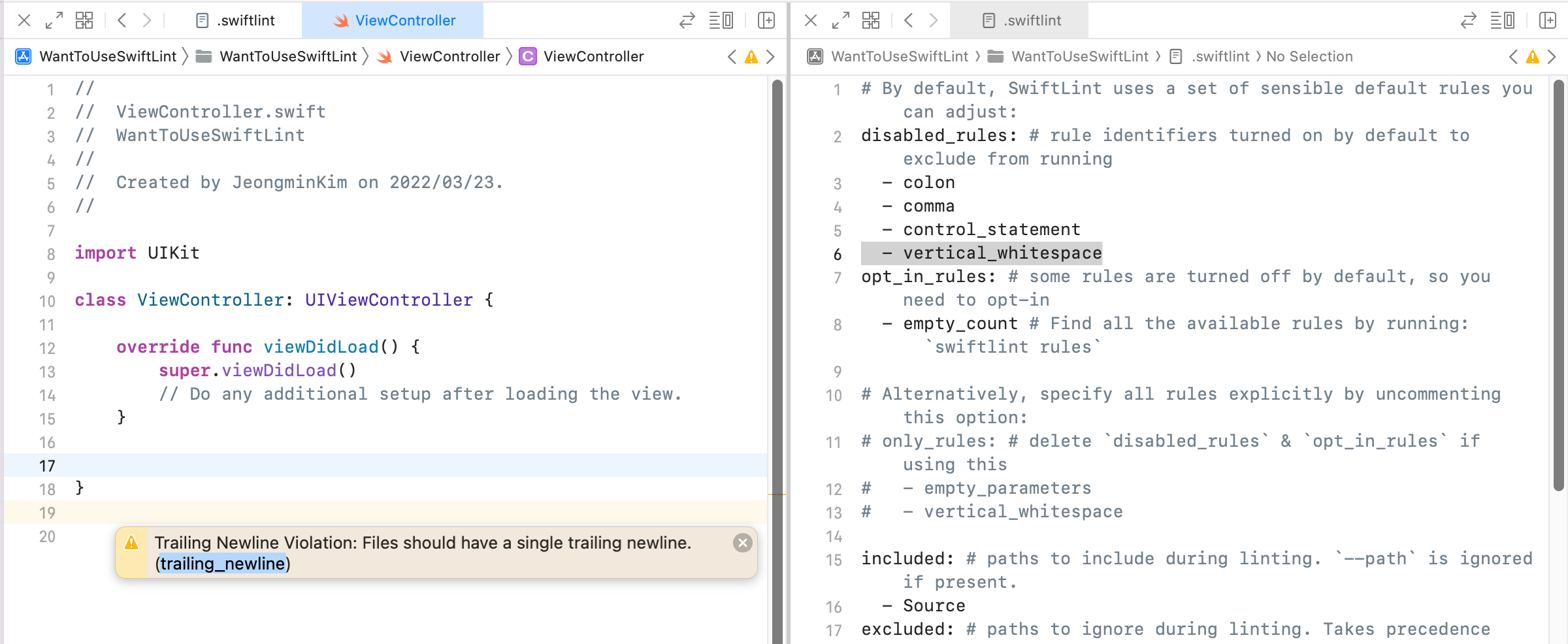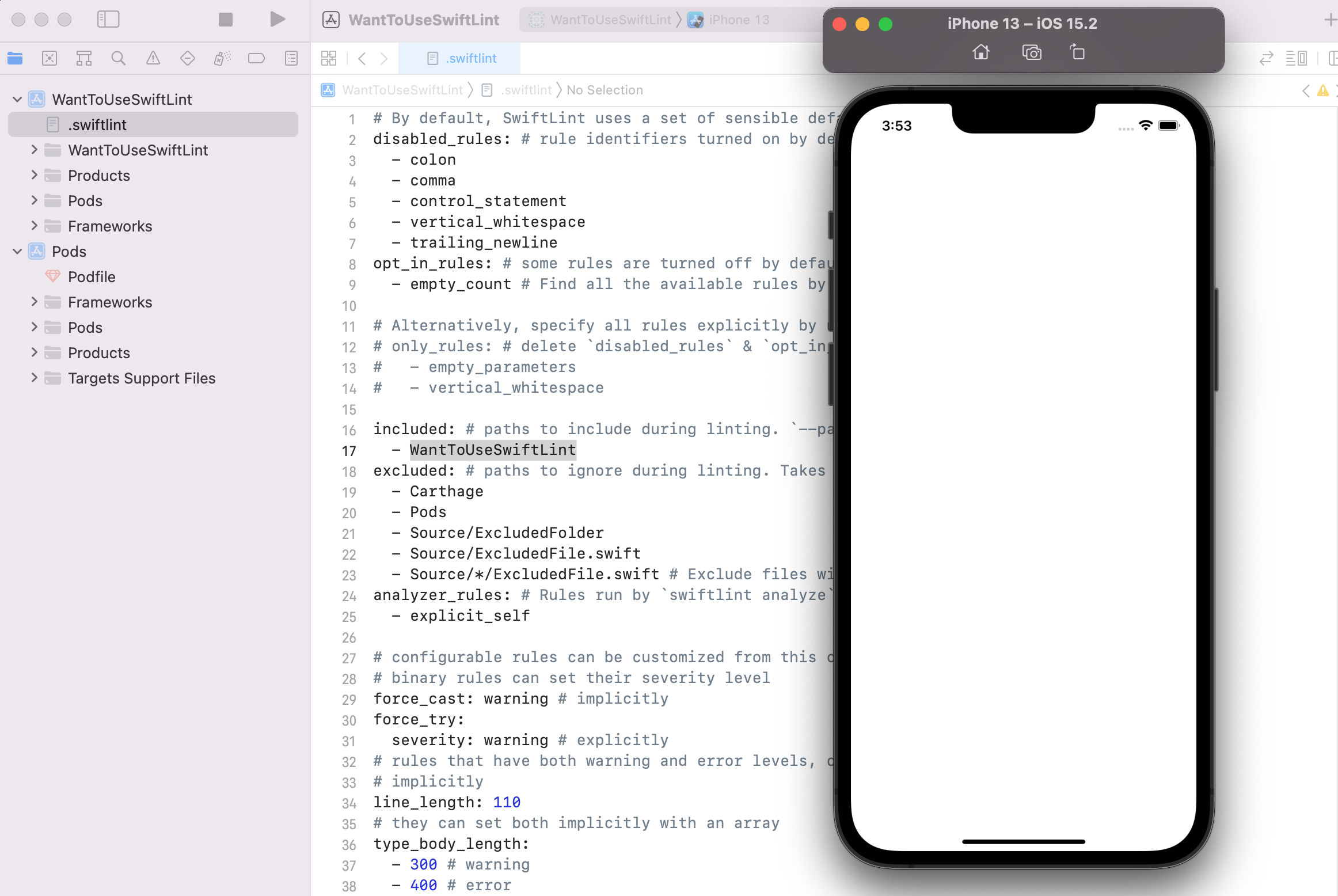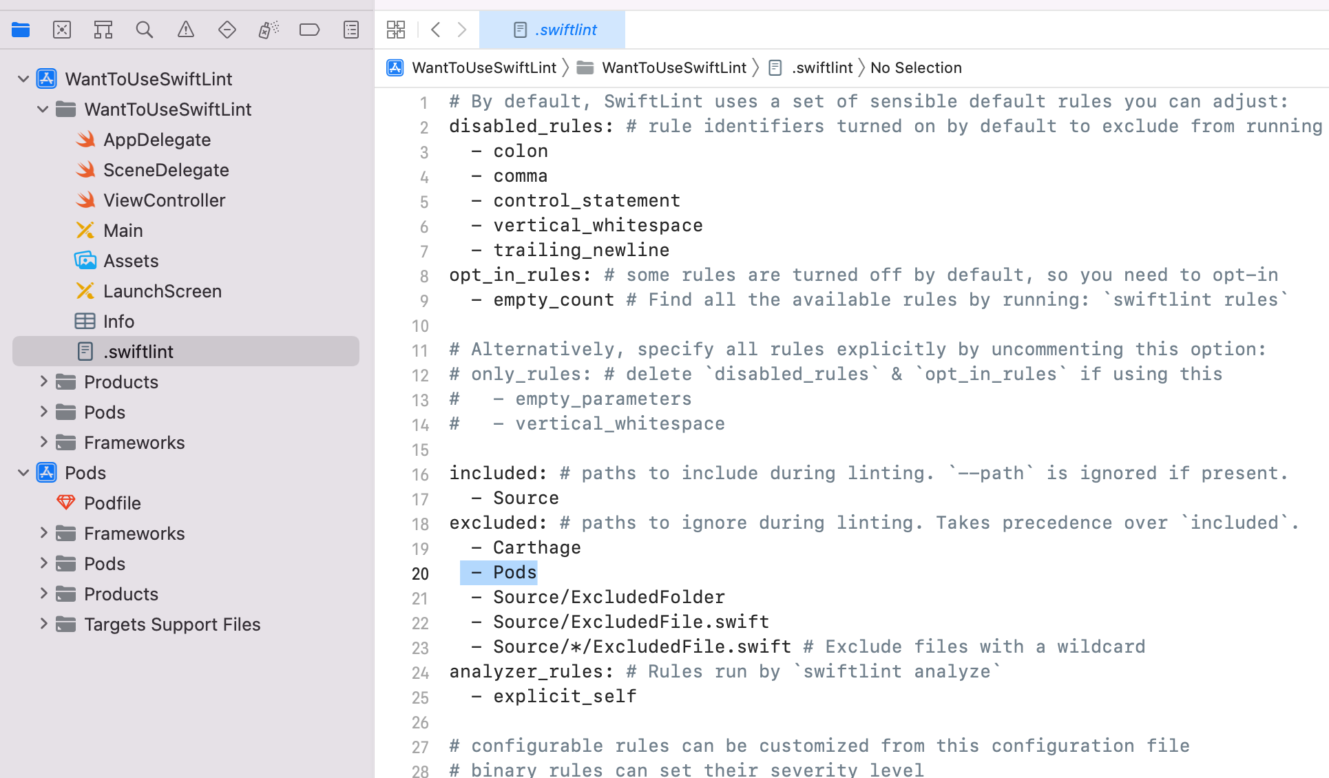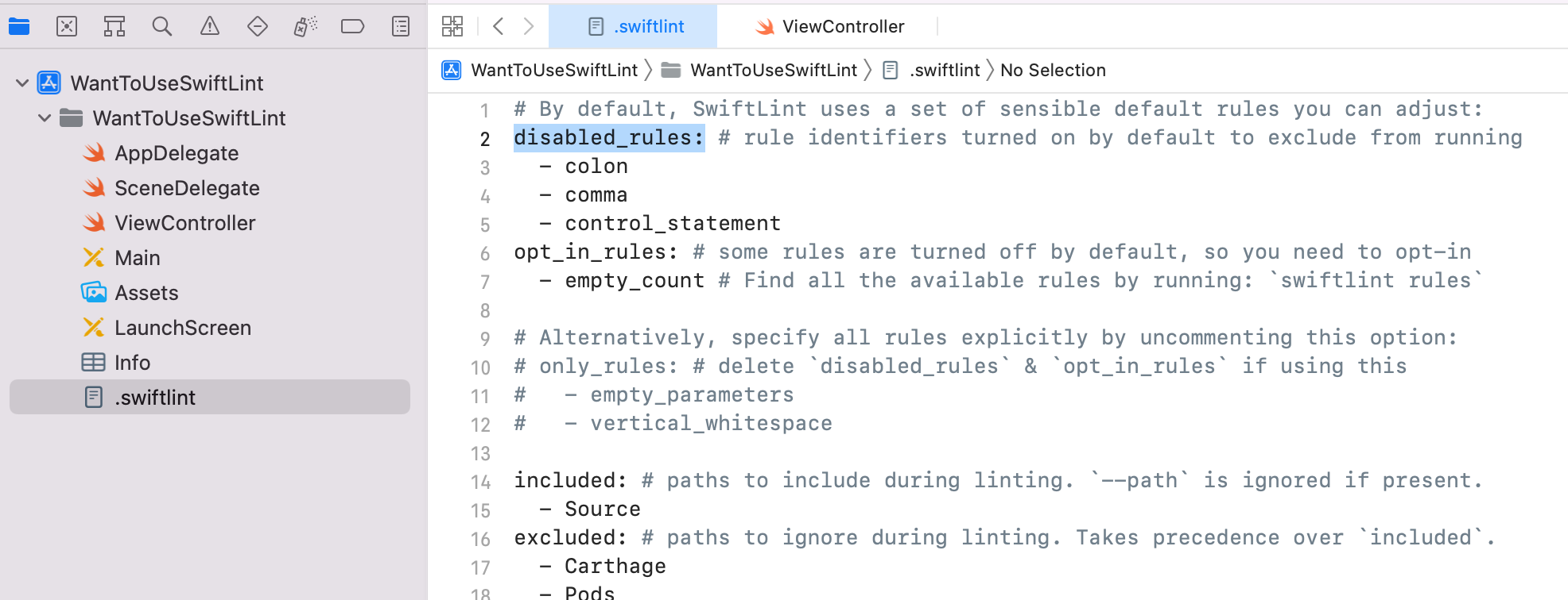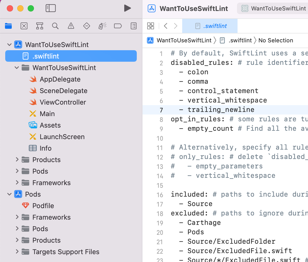 As you see, now .swiftlint.yml file is under 'WantToUseSwiftLint' folder, not under project file.