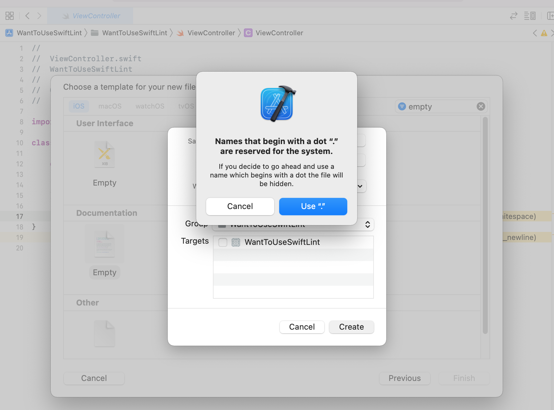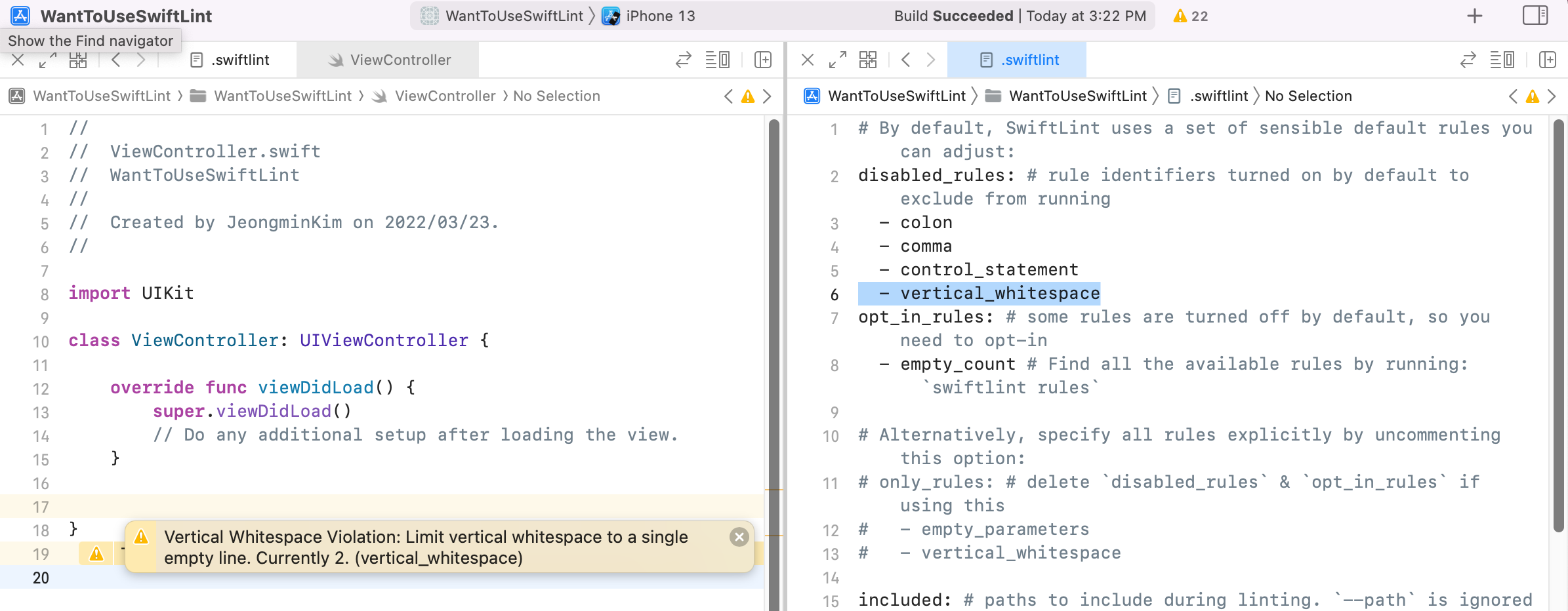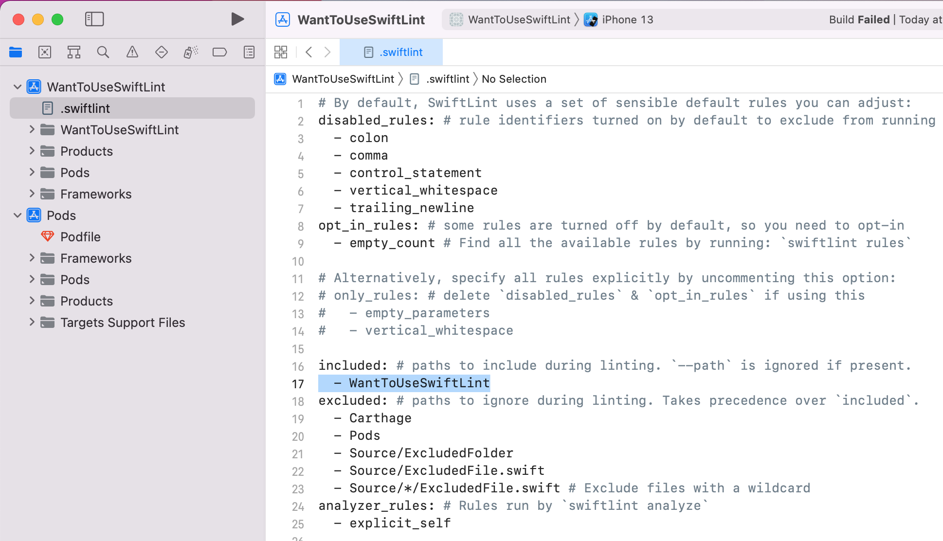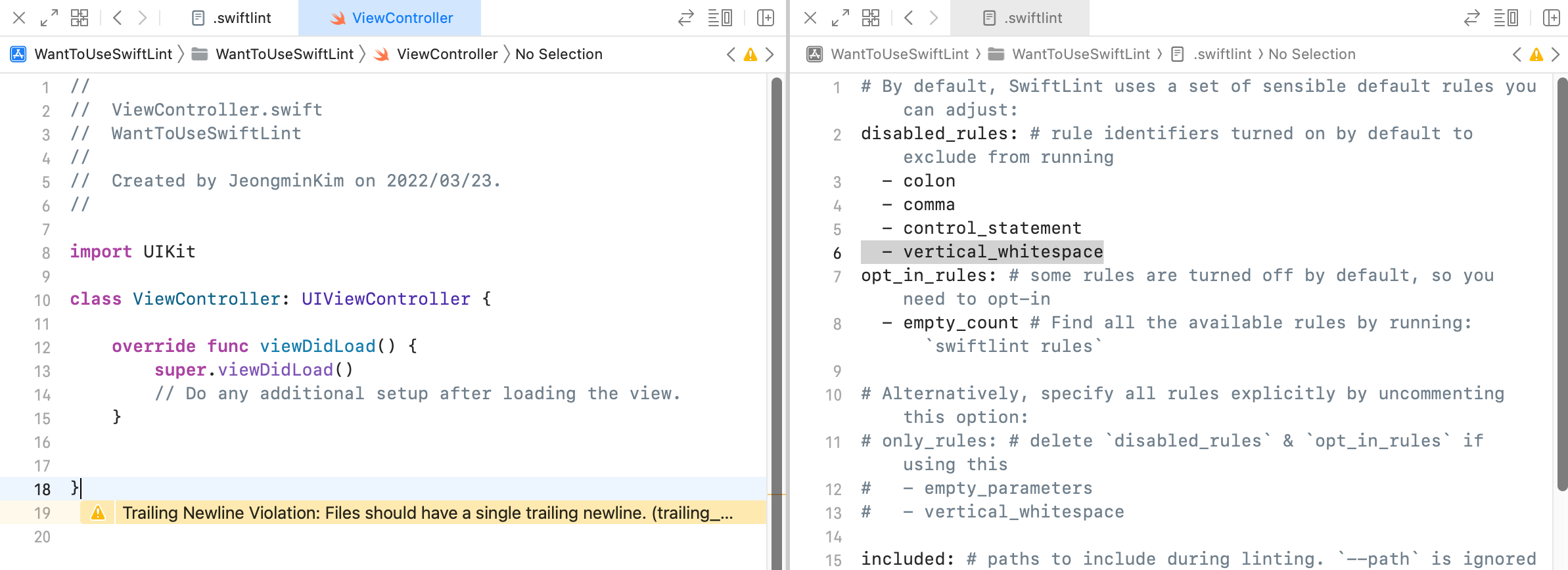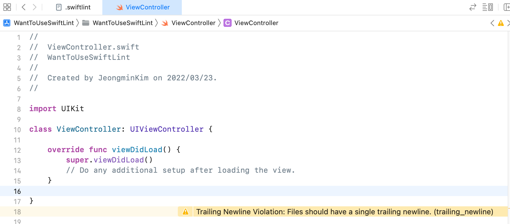 As you see, now .swiftlint.yml file is under 'WantToUseSwiftLint' folder, not under project file.