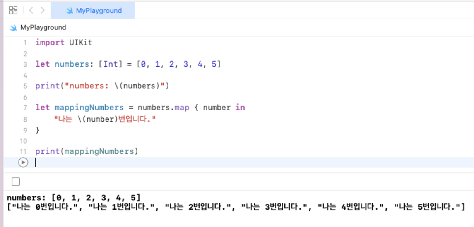 아까 사용했던 numbers를 그대로 사용하는데, 이번에는 numbers 내부의 각 요소를 String 타입으로 활용해봤습니다.
