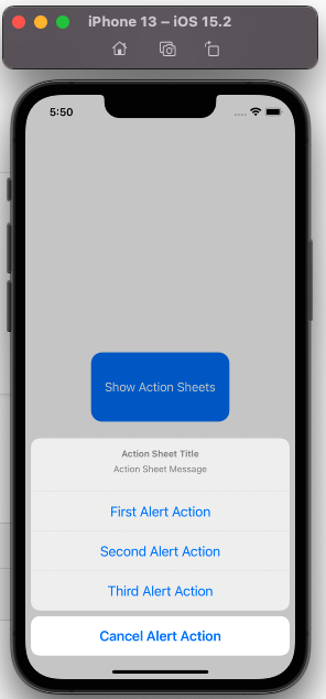 Action sheets An action sheet is a modal view that presents choices related to an action people initiate. DEVELOPER NOTE When you use SwiftUI, you can enable action sheet functionality in all platforms by specifying a presentation modifier for a confirmati